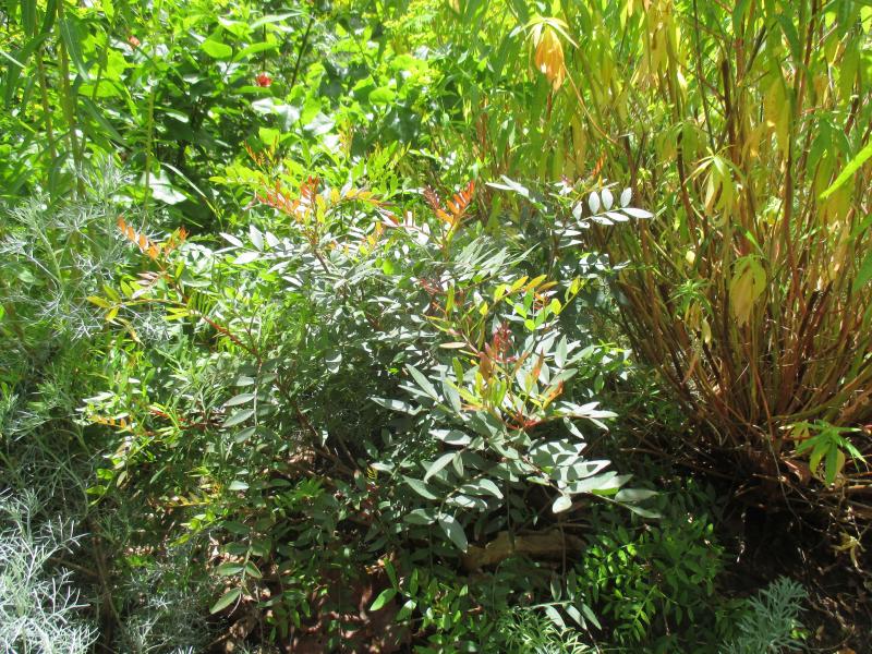 Nach 5 Jahren zeigt Pistacia lentiscus auch Zuwachs. Der Austrieb zeigt sich erfreulich fabintensiv.