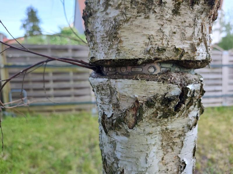 Meint ihr, die Birke ist noch zu retten? Das Stahlband herauszuoperieren, wäre wahrscheinlich keine gute Idee, oder?