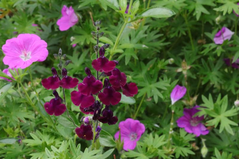 Eine liebe Gartenfreundin hatte mir letztes Jahr Salvia ´Nachtvlinder´geschenkt, die problemlos im Beet überwintert hat. Nun kämpft sie sich durch Geranium sanguineum.