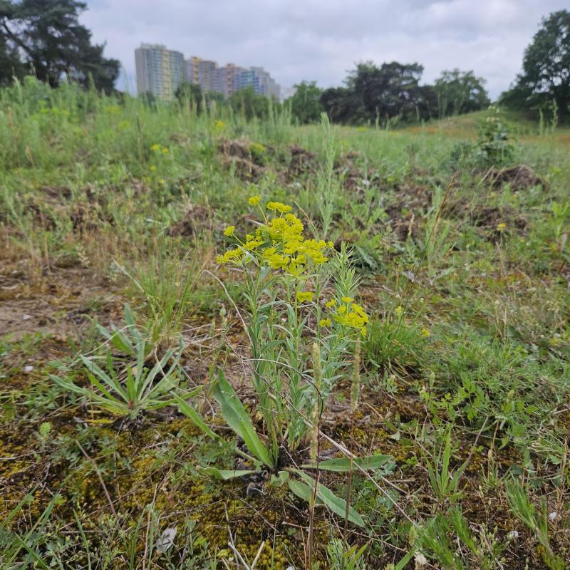 Steppen-Wolfsmilch, Euphorbia seguieriana. "Sie gedeiht in Mitteleuropa am besten auf trockenwarmen, basenreichen, nährstoffarmen Löß- und Lehmböden." Wikipedia