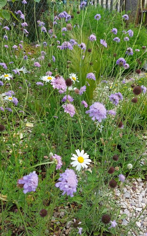 Heute, kurze Regenpause, Garten Südseite, Taubenskabiose, Margeriten, Bergklee...