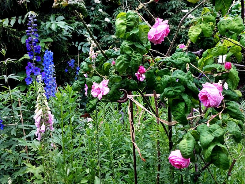 Eine Woche war ich im Urlaub und habe trotzdem jeden Tag einen Blick ins Forum geworfen und mich an euren Gärten erfreut. Bei meiner Rückkehr war ich erstmal etwas erschlagen. Einfach alles, inclusive dem Rasen war in die Höhe geschossen. Sah aus wie Urwald. Aber sieh da, nachdem der Rasen gut gekürzt, einiges zurückgeschnitten und die Rasenkanten bereinigt waren, hatten sich der Dschungel gelichtet. Und: alles wird allmählich sommerlich bunt... bunt und sehr üppig. Hier ist es das Jahr der feuchtigkeitsliebenden Pflanzen. Fingerhüte, Geum, Glockenblumen, Waldgeißbärte... alles ist gefühlt doppelt so groß nach den überreichen Regenfällen.