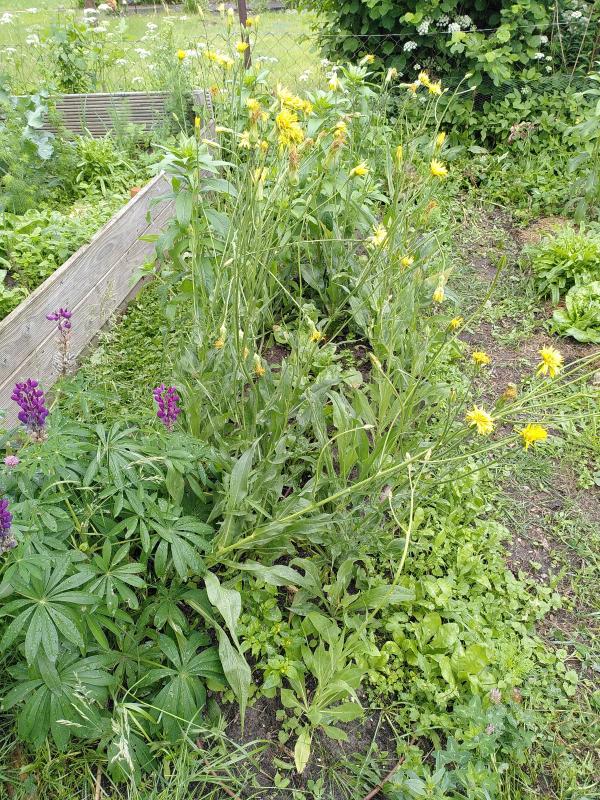im letzten Beet in diesem Bereich blüht gerade die Schwarzwurzel auf. Dazwischen eine Reihe Schnittmangold und hinten noch Salate. Am Rande sieht man noch das Hochbeet, da sind v.a. Salate drin, etwas Fenchel, Kräuter und noch mehr Schnittmangold