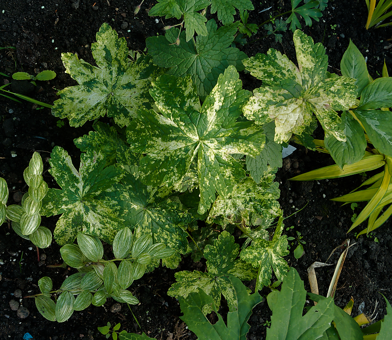 Vor Jahren bekam ich einmal in GB eine weißbunte und weißblühende Form von Geranium pratense, die leider schnell verschwand. Seither habe ich solche blaublühenden, gelb panaschierten Sämlinge im Garten.