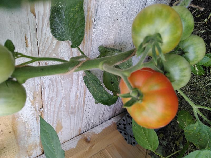 Hier ist die erste Tomate fast erntereif. Quedlinburger frühe Liebe, am 3.2. gesät.