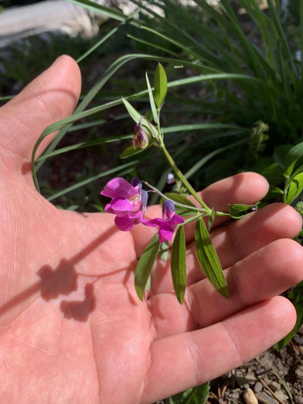 Die Bergplatt Erbse gefällt mir auch sehr gut sie blüht immer noch. Unten ein Bild eines eher lila strain ohne blau Ton ,angefangen zu blühen hat es etwa zur selben Zeit wie Lathyrus vernus