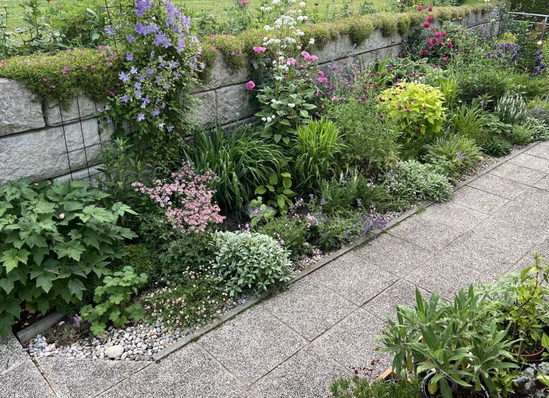 Hier ein Eindruck vom Beet an der Westseite, das einen großen Teil seines (plattgeregneten) Klatschmohns verloren hat.