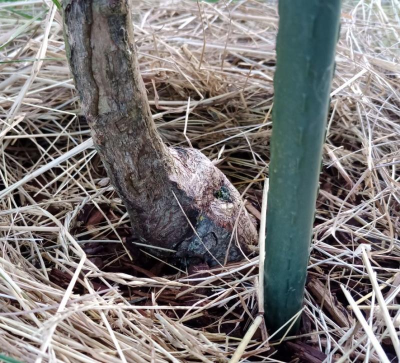 Ich habe noch eine zweite Goldparmäne. Bzw. es sollte eine sein lt. Auszeichnung. Diese habe ich im Gartencenter mit unbekannter Unterlage gekauft und diese steht im Topf. Ausgepflanzt hatte ich diese nicht auf Grund der unbekannten Unterlage und weil die Veredelungsstelle sehr abenteuerlich aussieht. Daher hatte ich mir den Baum in den Bildern davor auf die M111 Unterlage veredeln lassen.