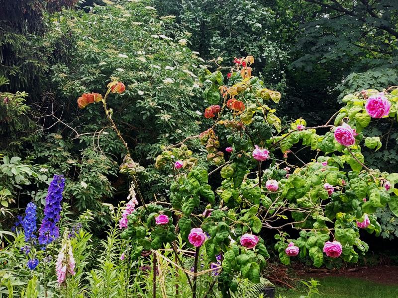 Rittersporn, Fingerhut , Rose ( Zentifolie), im Hintergrund Holunder.