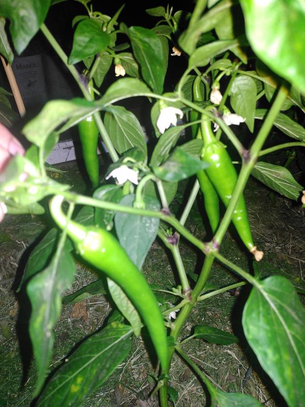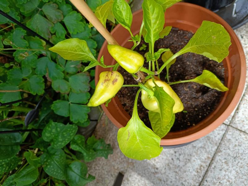Ich habe eine Marbles (C. annuum) neben einer Petits Becs (C. chinense) stehen, beide in grossen Töpfen.