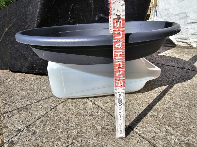 Es schwimmt unbeschwert jetzt noch etwas hoch auf, manchmal sind Luftblasen in der Höhlung des Untersetzers und ich muss den Rand noch hochziehen und fixieren. Aber eigentlich macht das doch einen ganz guten Eindruck? . Ich könnte auch noch Löcher in den Untersetzer machen, damit die Luftblasen auf jeden Fall raus können. . Oder doch umgedreht mit dem Rand nach oben und Löchern unten drin, damit kein Wasser drin steht? Dann würde der Rand des Pflanzsacks automatisch hoch kommen. Ich probiere das mal kurz aus.