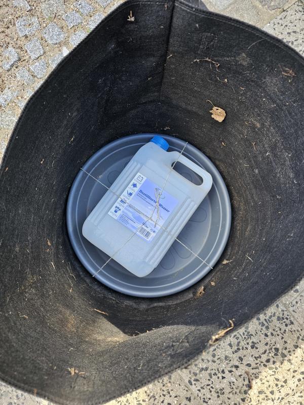 Also ich habe jetzt den Kanister mit einer polyesterschnur in der Innenseite des Untersetzers fest gebunden. Dann habe ich das ganze in einen alten Pflanzsack gestellt.