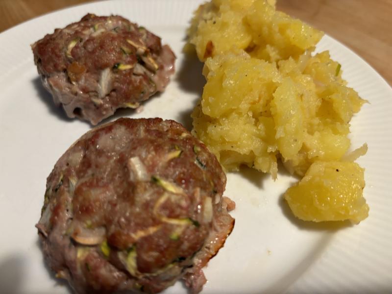 Faschierte Laberl mit Erdäpfelschmarren. Leider war ich zu gierig, um die Zwiebel gescheit zu bräunen.