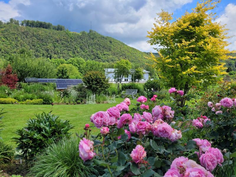 Blick zurück zum Terrassenbeet... hier blühen die Rosen gerade sehr üppig bei nun wieder dramatischem Himmel. :o