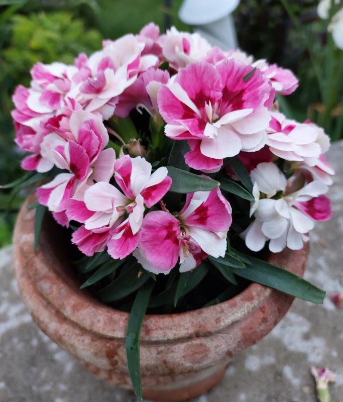 Mehrfarbige Dianthus. Aus Platzgründen im Topf.