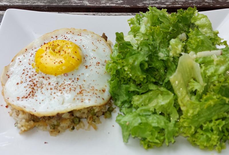 Braumeister mit Erbsen und Pilzen, Spiegelei und Salat