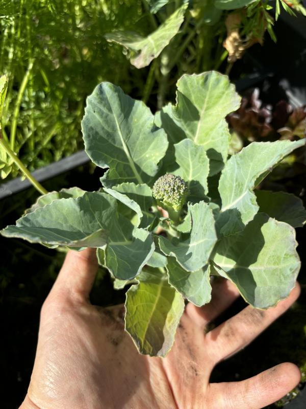 meine Brokkolipflanze ist gerade mal so groß wie eine Hand, bildet aber bereits eine kleine Brokkolirose.