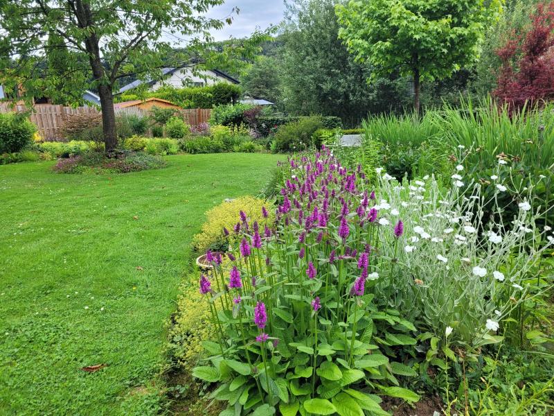 Hier ist vor der Phloxblüte mehr Zerstreutes. Der 'Hummelo'-Ziest und seine vielen Kinder sorgen für leuchtendes Rosa im Garten. 'Ukki' bleibt stabil unter 20 cm Höhe. Eine wirklich gute, besondere Sorte, weil sie dabei auch kraftvoll blüht.