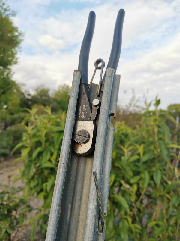 Ansonsten einen Seitenschneider mit Innenfeder (die nach dem Schneiden die Backen wieder auseinanderdrückt) für die Zaunfelder und einen Saitenschneider mit längerem Hebel für Spanndrähte. Dünneres Kaninchengitter kann gut mit Stichsäge für Metallschnitte geschnitten werden.