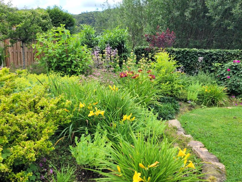 Hemerocallis 'Purplelishious' & 'Stella d'Oro' mit Penstemon 'Dark Towers', dazu Alchemilla mollis und immernoch Phlomis Russeliana... :D