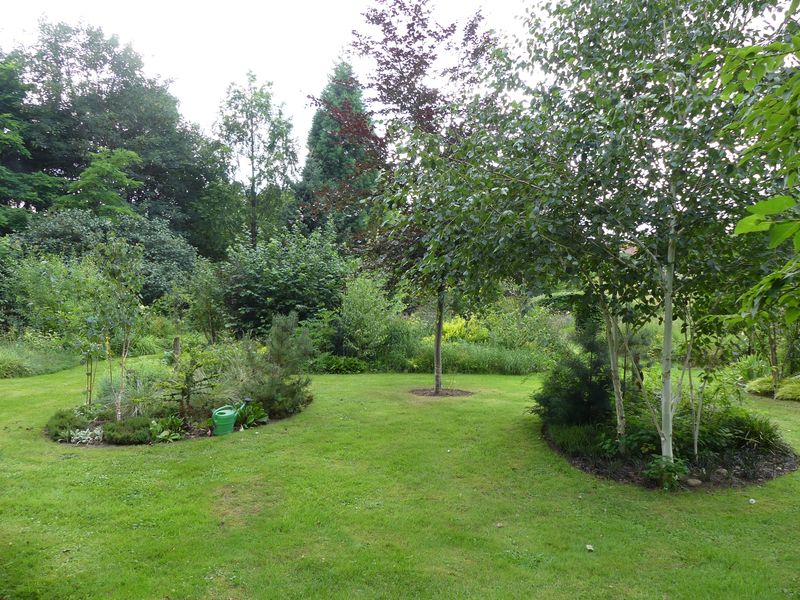 Ich sehe aber auch den dunkellaubigen Baum in der Mitte und links und rechts davor die gleich großen Inselbeete, rechts nun sehr voll mit den Birken und links dagegen relativ frei. Vermutlich ergänze ich unbewusst die Birken, weil ich weiß, dass sie da standen? Jedenfalls irritiert es mich, so, wie es jetzt ist. Ist ein Bauchgefühl.