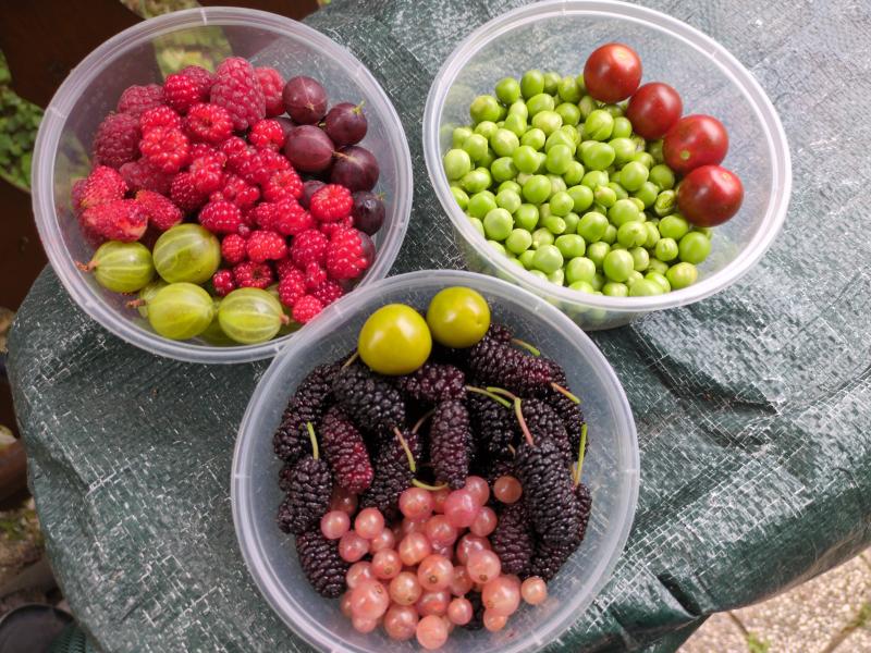 Heute hab ich ein kleines Bisschen von allem was gerade so verfügbar ist geerntet. Himbeeren, rote und grüne Stachelbeeren, Monatserdbeeren, Japanische Weinbeeren, Physalis, Maulbeeren, rosa Ribiseln, Erbsen und Tomaten.