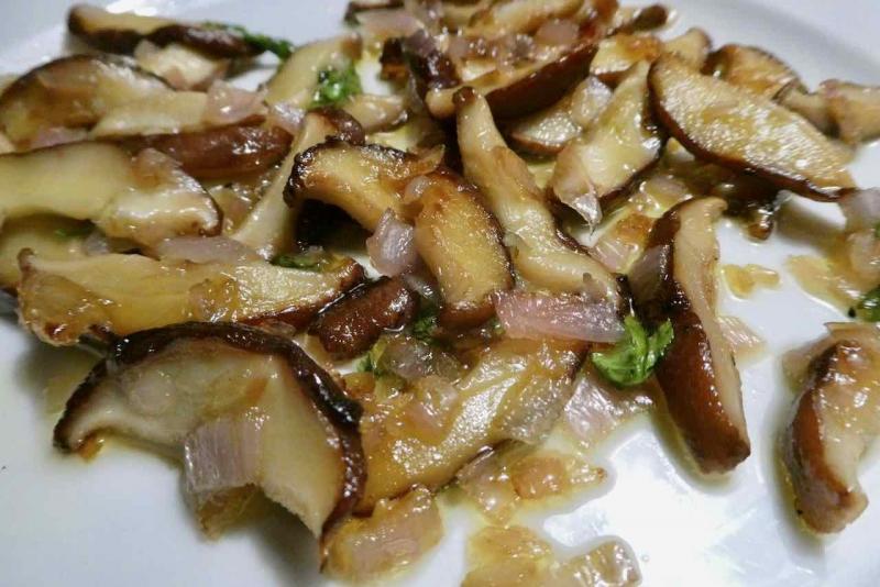 Vorspeise Shii Take-Pilze aus Bayern, mit Schalotten in Olivenöl und etwas Butter gebraten und mit weißem Balsamico abgelöscht