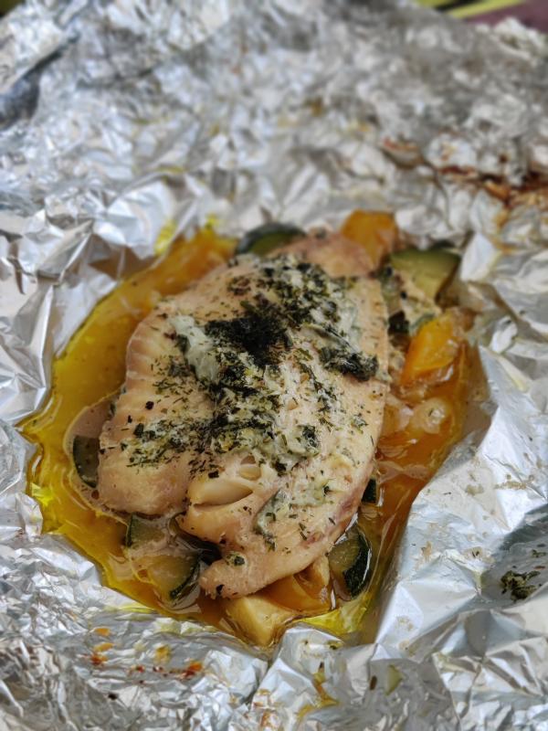 Das funktioniert der auch ganz wunderbar. Gemüse nach Wahl in mundgerechte Stücke (Paprika, Zucchini, Schalotten, Champignons, Möhre, Knoblauch, ...), Kräuter nach Wahl druntermischen (frisch, TK oder getrocknete), Fisch mit Salz, Pfeffer, 1-2 EL Sojasoße und ebensoviel gutem Olivenöl würzen, mit ein paar Scheibchen Gorgonzola belegen und Dill drüber. Folienpaket (zwei Lagen) gut schließen und 25-30 Minuten auf den Grill oder in den Ofen. Brot als Beilage ist obligatorisch wegen dem leckeren Saft, der entsteht.