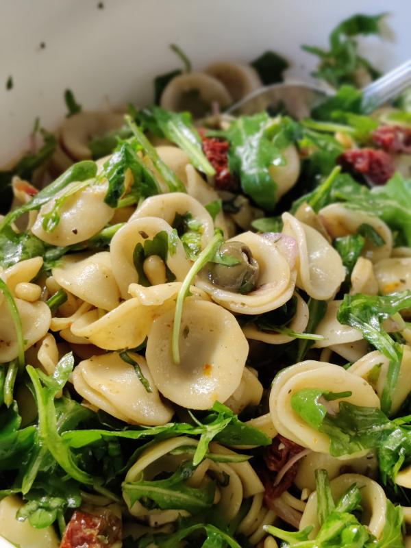 Dazu gab es neben Baguette noch Nudelsalat mit Oliven, Tomaten, Rucola und Feta. Die Nudeln waren etwa trocken, mussten aber mal weg.