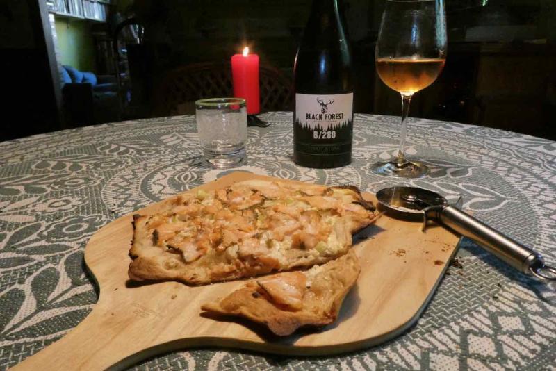 Tarte flambée mit Dinkelmehl, Creme fraiche, gemischt mit etwas Kren