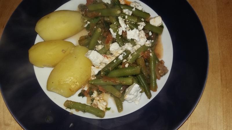 Hier gab es frische Pellkartoffeln mit grünen Bohnen (rote Zwiebel, Tomaten und Petersilie) und Schafskäse :D