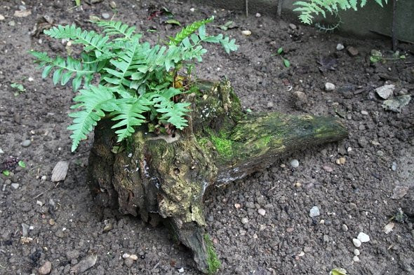 Den 1 Meter hohen Stumpf habe ich umgedreht und einen Polystichum set. Plumosum Densum eingepflanzt.