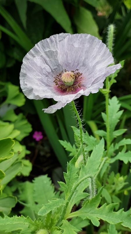 Nein, Schlafmohn kreuzt sich nicht mit Klatschmohn. Bei mir wandert er auch durch den Garten, in vielen Farben. Mal dunkelviolett, mal Rot, mal blassrosa.