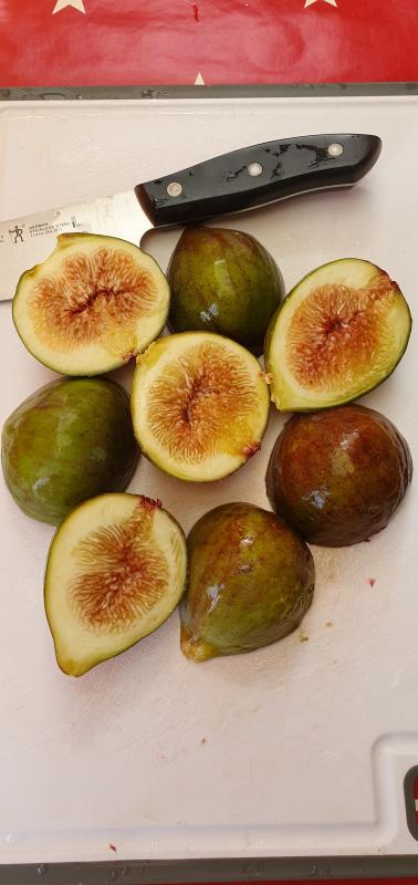 Innen sah die Feige ungewohnt aus, in der Mitte hellrot und ganz dunkelrot, fast schwarz am Rand. Verdorben war da nix, leichte Beerennoten aber nicht viel geschmackliche Tiefe und moderat süß. Ich habe schon bessere Blütenfeigen gegessen, aber definitiv auch schlechtere.