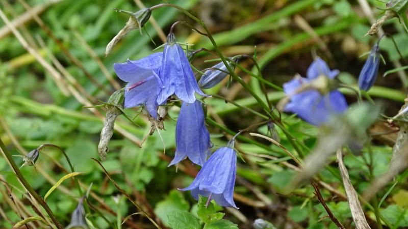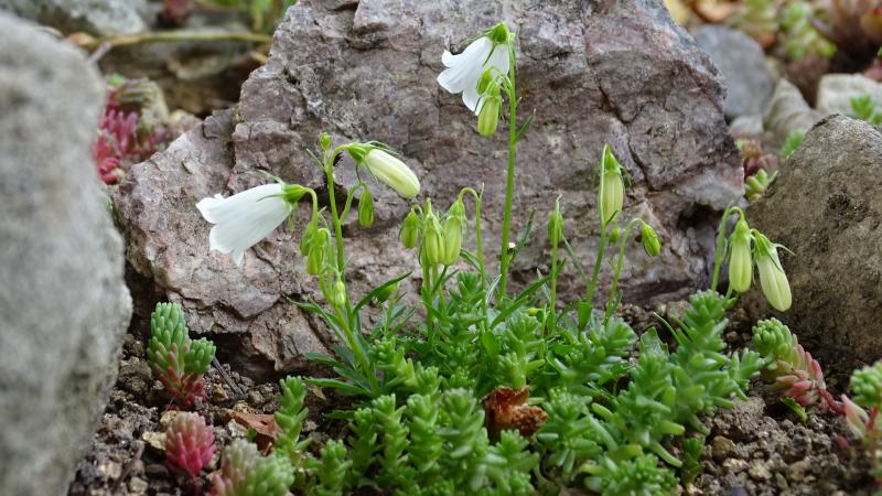 Ich frage mal dazwischen denn bei uns blüht ein Winzling und ich hätte gern den Namen. Ausserdem suche ich diese Glockenblume auch in blau. Ich hoffe auf euer Fachwissen. Danke im voraus.