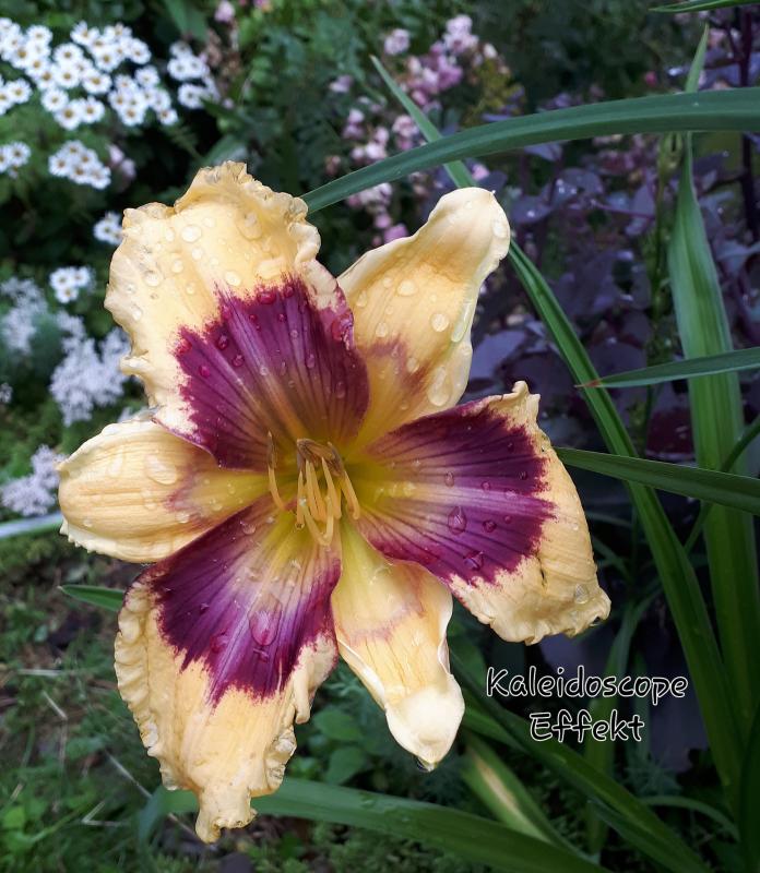 Summer Wine nach dem Wolkenbruch gesternnacht. Die Ufos und Spider, die nicht gestäbt waren, liegen platt. Teilweise abgebrochen. Die weissen Lychnis haben sich dazwischen gemogelt.