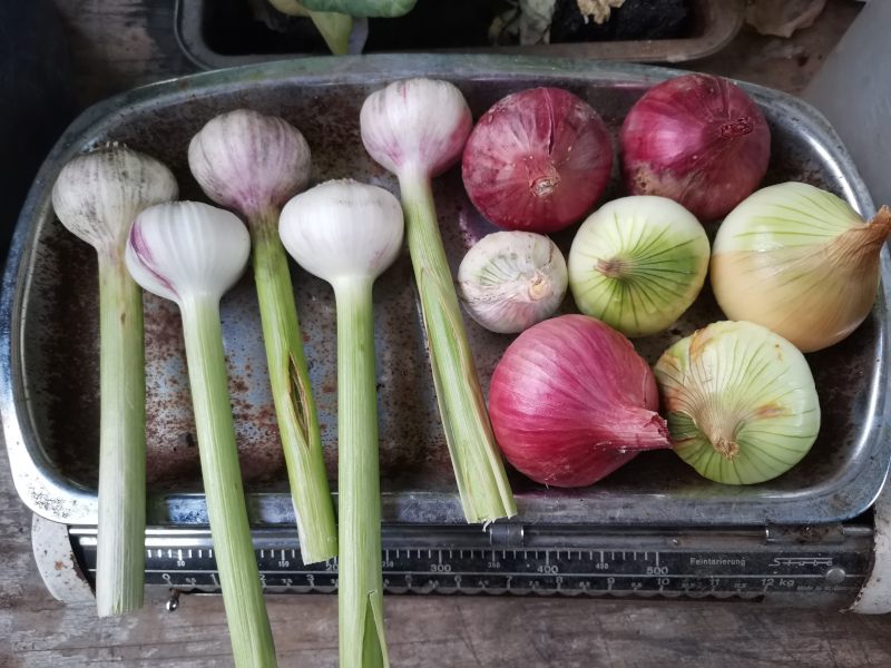 Sehr schön dein Knobli... Meine fallen nach dem Rostbefall und der Nässe zusammen mit den Kartoffeln und wohl auch den Tomaten, Auberginen und Gurken in die Kategorie "Better Luck next Year"... Die eine Sorte hat nicht mal Zehen ausgebildet, die man sehen kann und die andere ist klein und aufgeplatzt, auf dem Bild sind vielleicht ein Viertel der gepflanzten Pflanzen.