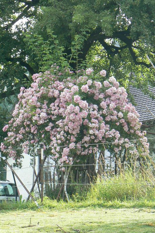 Auch so ein uralter Birnbaum, aber mit 'Paul's Himalayan Musk Rambler' bis fast in die Spitze und wieder herab hängend...