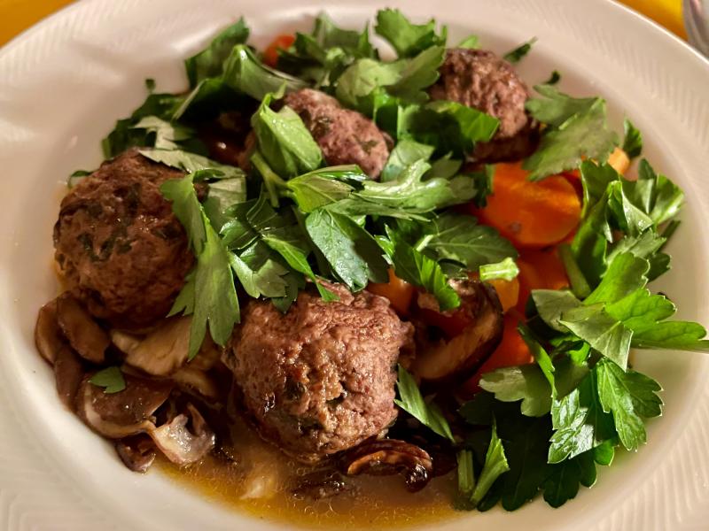 hier schichtauflauf bzw. ofeneintopf mit karotten, knoblauch, braunen champignons und gallowayklopsen.