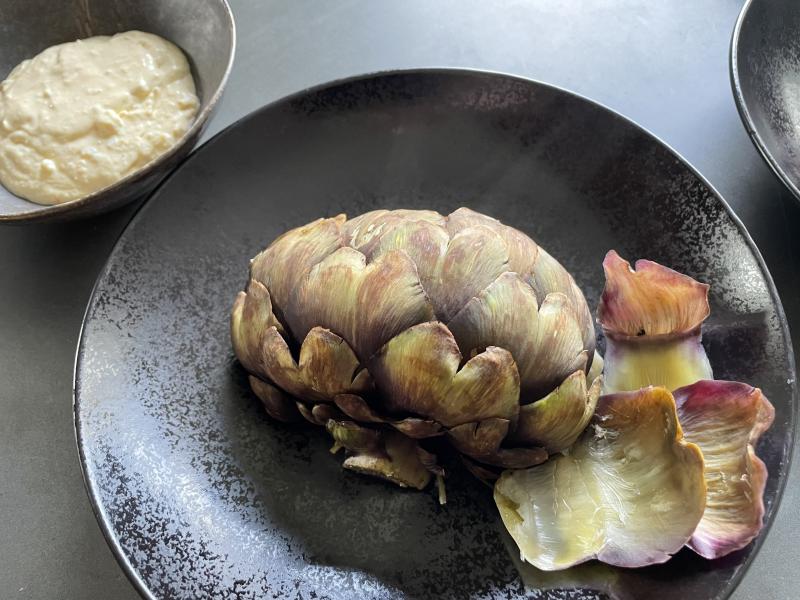 Heute haben wir herrlich große violette Artischocken entdeckt. Leider waren sie nach dem Kochen nicht mehr so bunt - aber ein wunderbarer Geschmack! :D Dazu gab es einen Dip aus einem dreiviertel Becher Creme fraîche zwei Teelöffel Senf und zwei hart gekochten Eiern alles pürriert und mit Salz und Pfeffer abgeschmeckt. Wirklich empfehlenswert! :)