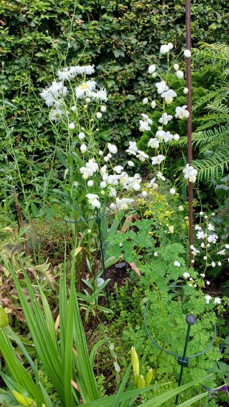 Eine kleine Thalictrum ohne Etikett und die Wuschelmargarithe.