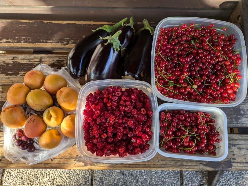 Dieses Jahr ist eher "Was habt ihr nicht geerntet" - da wären z.b. Blaubeeren die fast komplett an die Spatzen gehen (Foto).