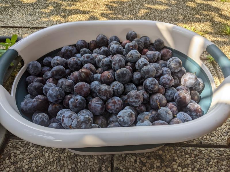 Was dieses Jahr auch wirklich super trägt ist unser Zwetschkenbaum. Nach zwei Jahren Komplettausfall wirklich erfreulich wie viele schöne Zwetschken wir ernten können. Heute war Haupternte. Nach Aussortieren der schlechten sind gute 25 Liter übrig geblieben. 5 Liter hat eine Freundin bekommen die bei der Ernte geholfen hat. Ich schätze mal ein guter Kübel voll wird noch am Baum hängen, aber sie sind zu weit oben als dass man mit der Leiter dran kommt und hängen noch zu fest um mit Schütteln runter zu fallen. Wir haben zwar einen Obstpflücker mit dem man wahrscheinlich ran käme, hatten dann aber keine Lust mehr danach zu angeln. Erstaunt hat mich, dass praktisch keine Madigen dabei waren. Es sind schöne große sehr aromatische Früchte von hervorragender Qualität - bis auf die die sich beim Kirschbaum mit Monilia angesteckt haben, aber das waren jetzt nicht so viele.