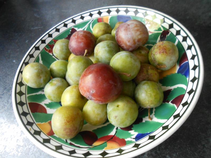 Wir haben dieses Jahr zum ersten Mal eine nennenswerte Menge an Reineclauden geerntet. Zuerst hatten wir einen Baum der großen grünen R., die nie Früchte trug, bis wir einen zweiten Baum (Graf Althans) als Befruchter pflanzten. Nach mehreren Jahren trugen nun beide, der zweite wenige, aber große Früchte, der erste viele kleine. Die Graf Althans sind ziemlich fest, lila und nicht so süß, sie erinnern an Zwetschgen. Die große grüne weich und zuckersüß. Sie sind so, wie ich sie von einem Baum im Garten meines Elternhauses in Erinnerung habe. Leider vergammeln die sehr schnell.