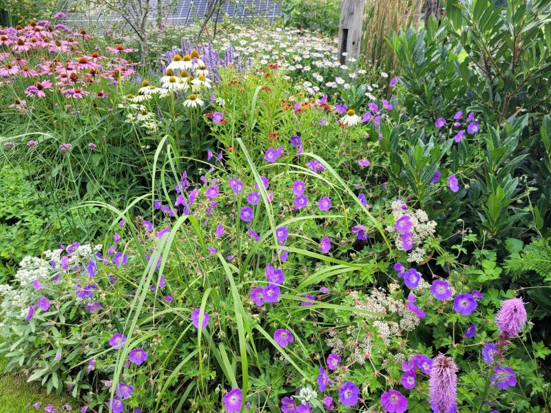 Rozanne rankt sich hier in diesem Jahr etwa 1,5 Meter hoch in die Rosen hinein... noch höher als üblich und teilweise auf Höhe der Rosenblüten. Muss wohl der Regen sein.