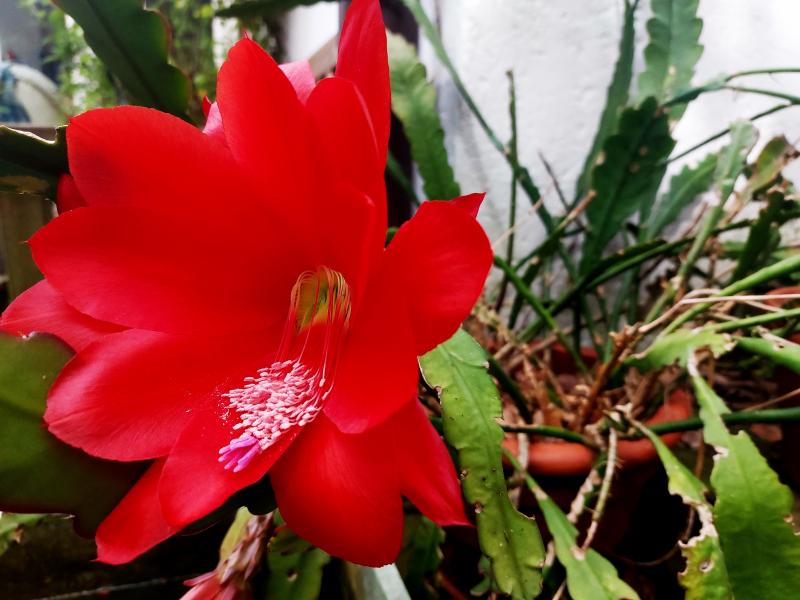 Epiphyllum, roter Blattkaktus, erste Blüte dieses Jahr.