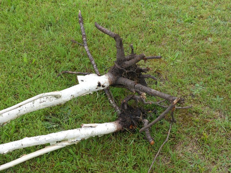 Die größte Betula utilis 'Doorenbos' trieb im Frühjahr nicht mehr aus und hatte direkt sehr brüchige Äste. Das zweite Exemplar der Gruppe trieb noch zögerlich aus, blieb dann aber stecken. Beide konnte ich dann mit wenig Kraftaufwand umdrücken und aus der Erde ziehen. Die Ursache ist mir ziemlich unklar, am ehesten habe ich noch einen Pilz im Verdacht. Hallimasch-Myzel konnte ich aber zum Beispiel nicht finden. Wühlmäuse waren dort offenbar auch nicht zugange. Seltsam ist auch, dass beide Bäume mehr oder weniger zeitgleich ausgefallen sind.