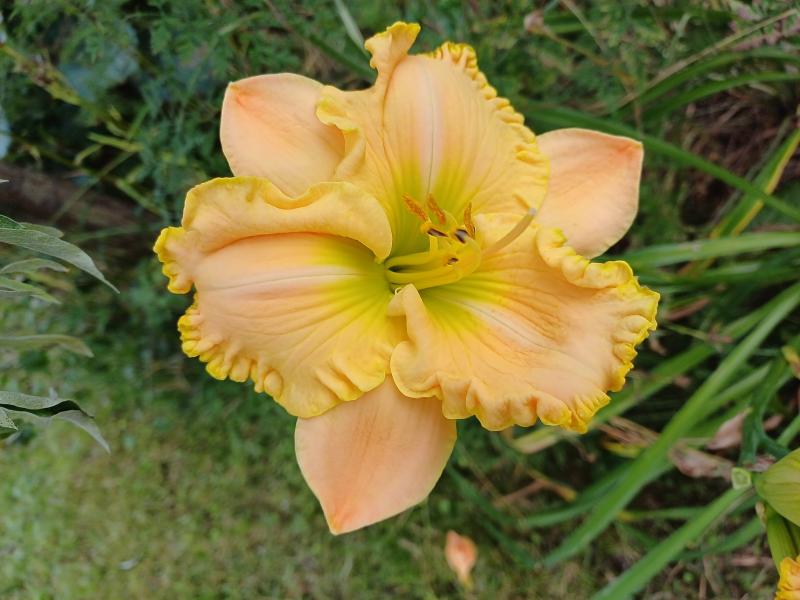 Einige großblütige Sorten gibt es hier auch, hier die letzte, aber erste unversehrte Blüte von 'Humungousaur' (Gossard 2013) Die Schnecken haben einfach alles gemeuchelt in dieser Saison. .
