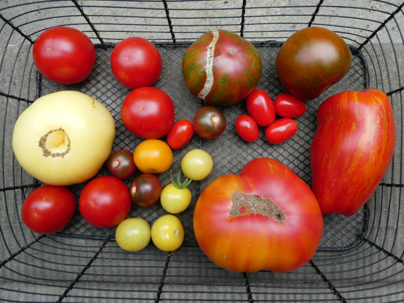 Inachis, das sind im Uhrzeigersinn: Die gelbe dicke links in der Mitte White Wonder, die mittelgroßen runden roten Bloody Butcher, die rot-grün gestreifte Copia green, rechts oben Paul Robeson, darunter (untypisch in der Form, weil zu gedrungen) rot-gelb gestreift Striped Roman, die dicke unten orange-rot ist Tennessee Surprise, die ganz kleinen hellgelben sind Snow White Cherry, die roten Kirschtomaten Teardrop, die einsame orange Kirschtomate ist Orange Bourgoin und die roten Kirschtomaten mit den dunklen Schulter sind Reinhard Krafts Purple Sugar.