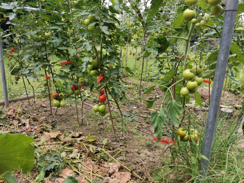Der Besitzer hatte vorher im Block angebaut und keine Lust mehr auf viel Arbeit, Platzverschwendung und umfallende Tomatenspiralen. Deshalb für kleines Geld jetzt die Zeile gebaut, da lässt sich auch der Fangkorb vom Rasenmäher viel leichter ausschütten und notfalls auch mal mit dem Grubber durchziehen oder ein Tropfschlauch legen.